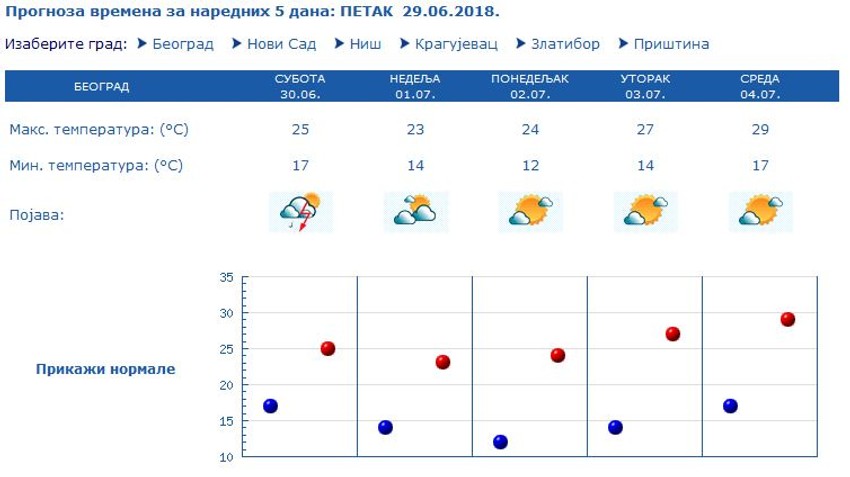 U Beogradu će biti umereno i potpuno oblačno, povremeno sa kišom i lokalnim pljuskovima sa grmljavinom. Posle podne i krajem dana se očekuje prestanak padavina i postepeno razvedravanje.