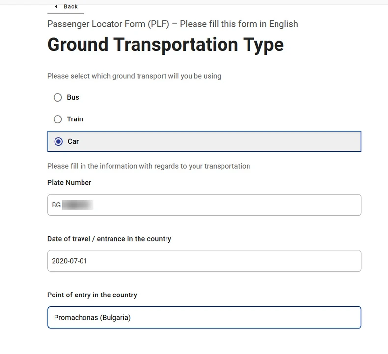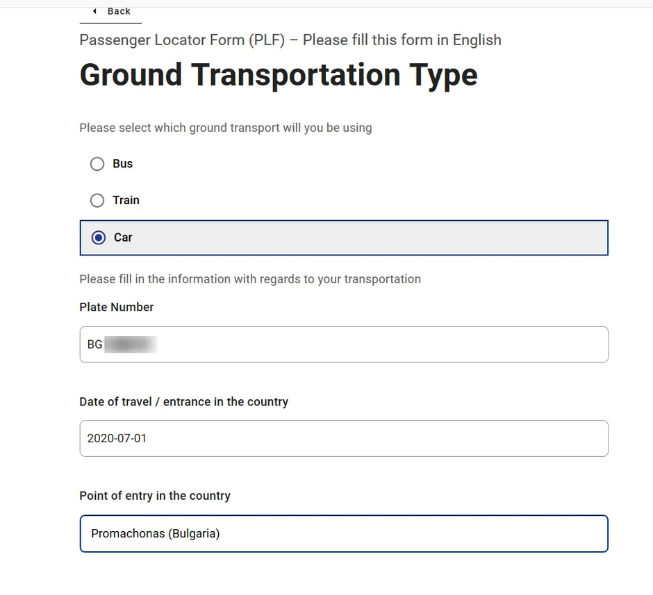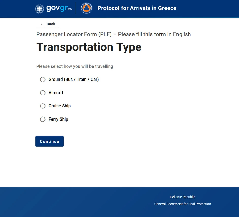 U prvom koraku popunjavanja formulara od vas se traži da napišete da li u Grčku dolazite, avionom, brodom ili kopnom, a ako je kopno u pitanju, morate označiti vrstu prevoza kojim dolazite (autobus, automobil).