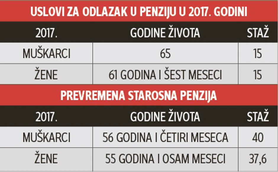 U Ministarstvu rada navode da su se uslovi za prevremenu starosnu penziju za muškarce i žene promenili u odnosu na 2016. godinu, te se tako starosna granica za odlazak u penziju kod muškaraca podigla za osam meseci, što je slučaj i kod žena, s tim da su kod njih godine staža takođe podignute za šest meseci.