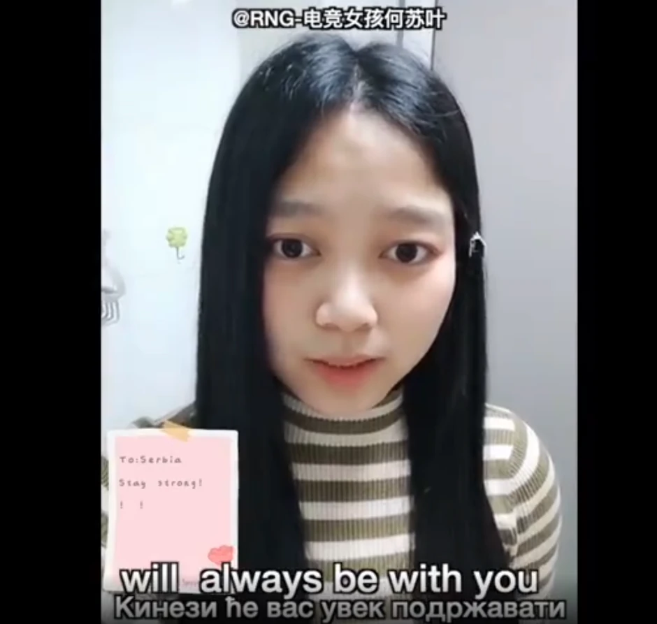 - Pozdrav za Srbiju, Kina je vaš prijatelj zauvek. Narod Kine uvek stoji uz srpski narod, pobedićemo virus - poručuje jedna kineska državljanka, dok jedan mališa poručuje da je on mlad, ali da se bez obzira na to moli da "stanovnici Srbije uskoro ozdrave".