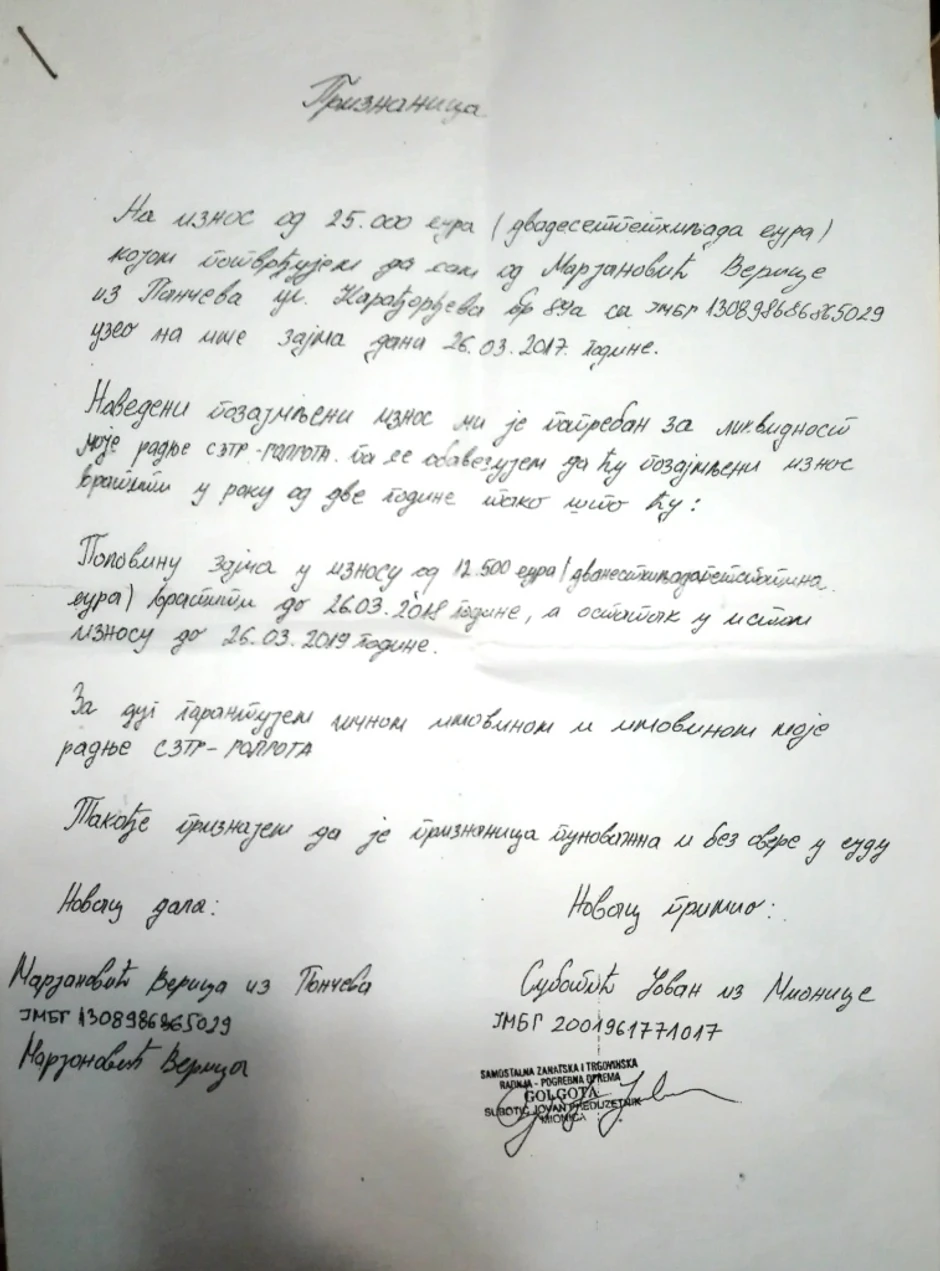 Po tužbi koju je dobio, Subotić je navodno još 26. marta 2017. godine od tužilje V.M. (32) pozajmio 25.000 evra, što se dokazuje rukom pisanom priznanicom u kojoj je navedeno da tužilja Jovanu na ruke daje tu sumu novca za likvidnost njegove SZR „Golgota“, a za dug, sa rokom vraćanja od dve godine, on garantuje svojom i imovinom radnje. Pošto, navodno, u tom roku nije platio nijednu od dve rate, niti joj se javio, V.M. u tužbi traži da joj pozajmica bude vraćena odmah, sa pripadajućom kamatom i uz plaćanje sudskih troškova.