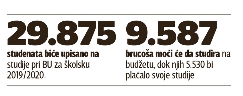 - Planiramo da upišemo 29.875 studenata, a od toga 15.117 na osnovne integrisane studije. Na budžetu će biti 9.587 studenata, a na master akademskim studijama 9.451, a od toga će biti na budžetu 4.090 studenata, dok će na specijalističkim akademskim biti na budžetu 52 od ukupno 916 studenata. Na doktorskim od ukupno 1.901 studenata na budžetu će biti 718 studenata. Brojevi se nisu značajno promenili od prošle godine - objašnjava prorektor Petar Bulat.