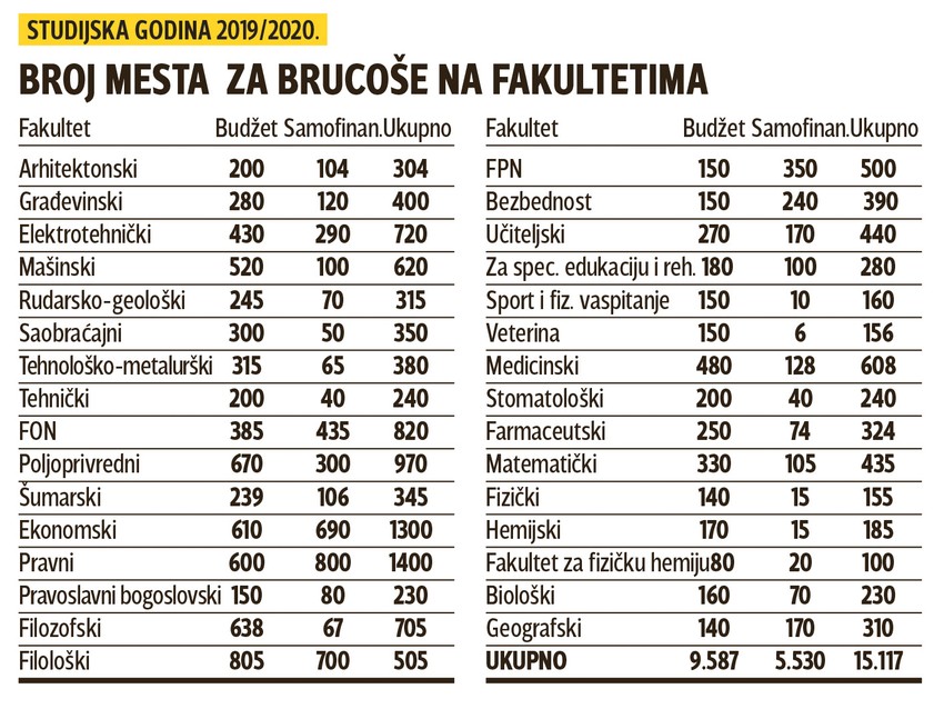 Fakulteti Univerziteta u Beogradu za školsku 2019/2020. godinu predložili su upis 29.875 studenata. Od tog broja, 15.117 mesta je za osnovne studije, od čega je 9.587 budžetskih mesta, a od toga bi 5.530 plaćalo svoje studije. Visina školarina za studijske programe na svim nivoima povećana je na Ekonomskom, Pravnom, Saobraćajnom, Mašinskom i Učiteljskom.