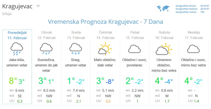 Maksimalna dnevna temperatura kretaće se od 0 do 5 stepeni.