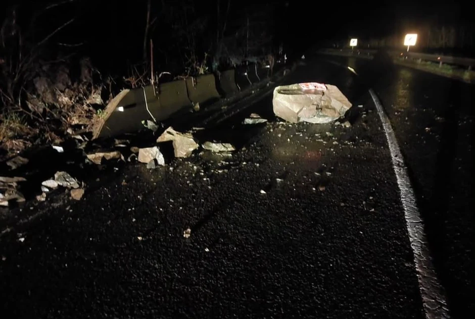 Na ovoj deonici puta, veliki kamen i nekoliko manjih, se odronio i ozbiljna opasnost za sve učesnike u saobraćaju, posebno u noćnim uslovima kada je vidljivost smanjena.
