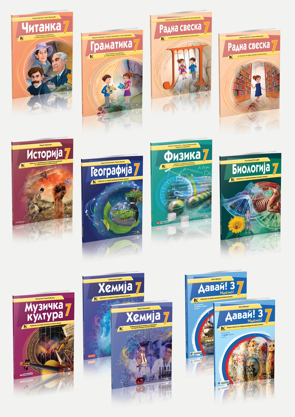 Rešenje Ministarstva prosvete za upotrebu u nastavi dobio je i komplet za Srpski jezik i književnost za sedmi razred OŠ, autora Vladana Bajčete, Janka Ivanovića, Jovane Jovanović i Marine Nikolić. Komplet se sastoji od Čitanke, Gramatike i Radne sveske uz Čitanku i Gramatiku. Rešenje je dobio i udžbenik iz Matematike sa zbirkom zadataka za sedmi razred OŠ autora: Verice Ilić, Jelene Aleksić, Nikole Mitrinovića i Sandre Andrić.
