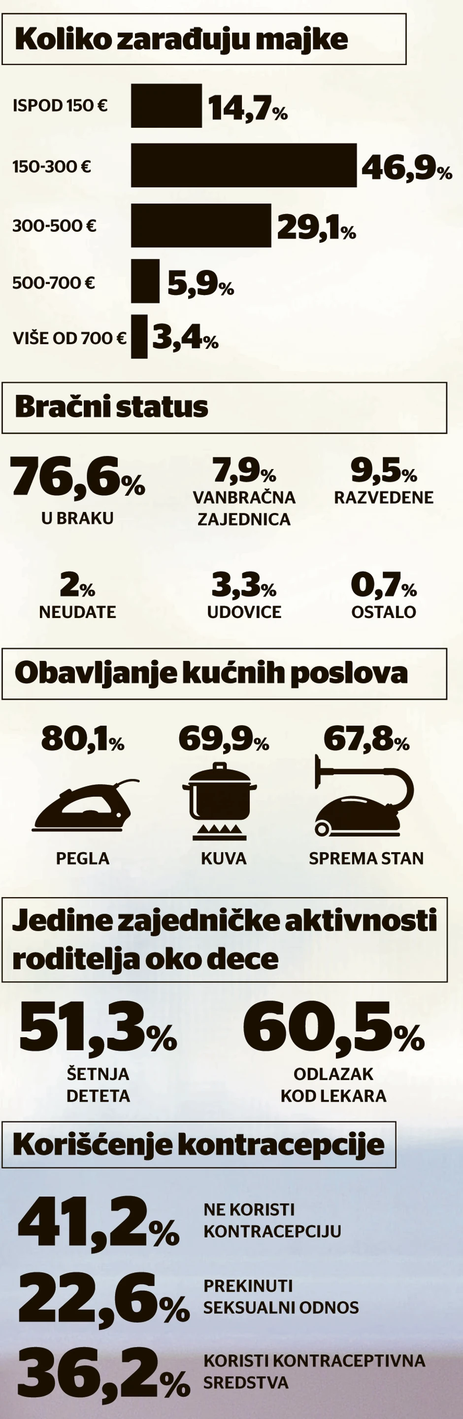 Majke u Srbiji pretežno zarađuju oko 300 evra, uglavnom rade honorarno i obavljaju sve kućne poslove. Uprkos željama da imaju troje dece, pretežno ih ima po jedno, a prilikom prvog porođaja imale su loše iskustvo. U najgorem položaju su najmlađe generacije.