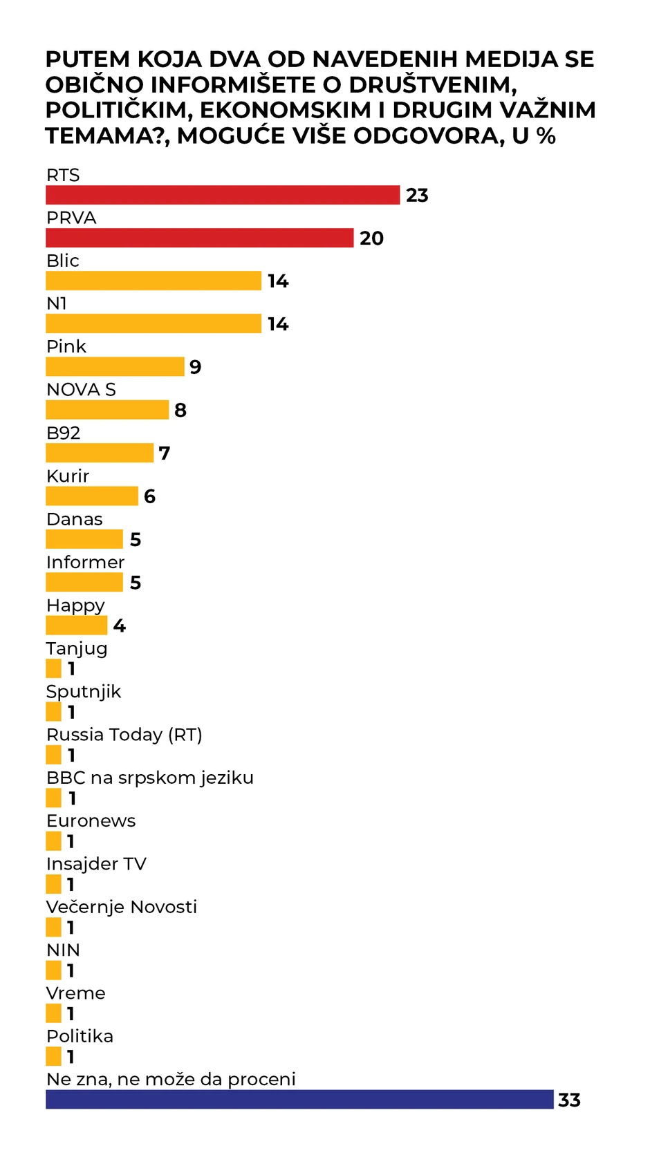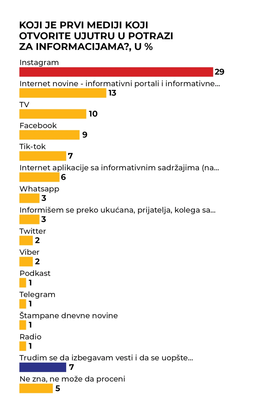 Kada je reč o informisanju mladih u Srbiji, najveći procenat mladih navodi da je Instagram prvi mediji koji otvore ujutru u potrazi za informacijama – 29%. Mladi u Srbiji se o društvenim, političkim, ekonomskim i drugim važnim temama najčešće informišu putem RTS-a (23%), PRVE (20%), "Blica" (14%) i N1 (14%).