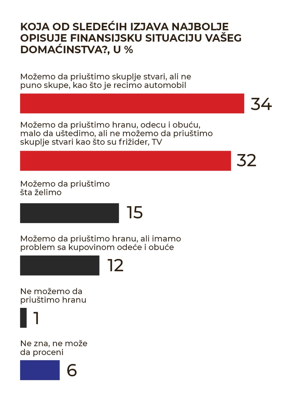 Vezano za finansijsku situaciju u domaćinstvu mladih ispitanika, istraživanje je pokazalo da najveći procenat mladih (34%) navodi da mogu da priušte skuplje stvari, ali ne previše skupe, kao što je automobil, dok nešto manji procenat mladih (32%) navodi da u njihovom domaćinstvu mogu da priušte hranu, odeću i obuću, uz malu uštedu, ali ne mogu da priušte skuplje stvari kao što su frižider, TV i slično.