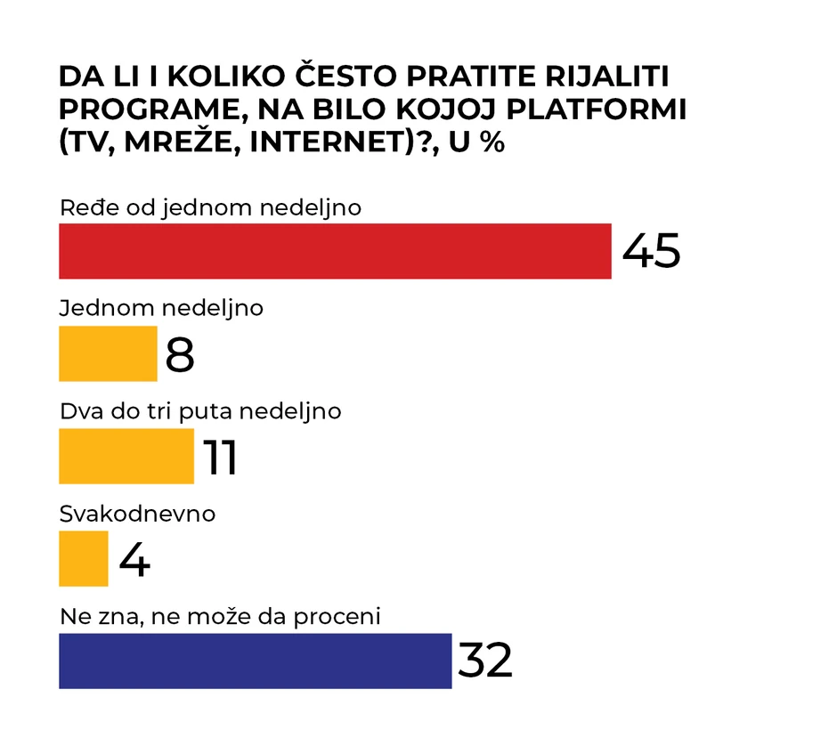 Rijaliti programe ređe od jednom nedeljno prati 45% mladih, dok 33% mladih navodi da ne zna, ne može da proceni koliko često prati rijaliti programe.