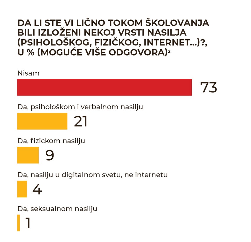 Najveći procenat mladih, čak 73% njih, nije bio izložen nekoj vrsti nasilja tokom svog školovanja, pokazalo je istraživanje na osnovu odgovara anketiranih mladih ljudi. Skoro svaki peti (21%) navodi da je bio izložen psihološkom i verbalnom nasilju, a 9% ispitanika reklo je da se suočilo sa fizičkim nasiljem u toku školovanja. Po 21%, ili gotovo po petina mladih, rekla je da je osetila nemoć i beznadežnost, kao i utučenost i potištenost, nakon što je pretrpela nasilje u toku školovanja.