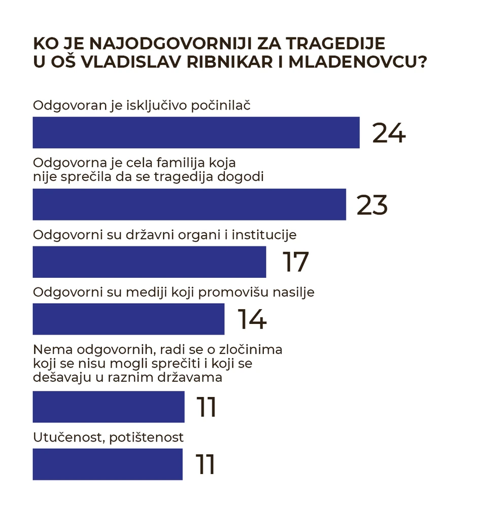 Kao glavnog odgovornog za tragedije u OŠ "Vladislav Ribnikar" i Mladenovcu, gotovo četvrtina mladih (24%) navodi isključivo počinioca, a da je odgovorna cela familija koja nije sprečila da se tragedija dogodi reklo je 23% ispitanika. Državne organe i institucije odgovornim vidi 17% anketiranih, a 14% njih navodi da su mediji koji promovišu nasilje glavni odgovorni.