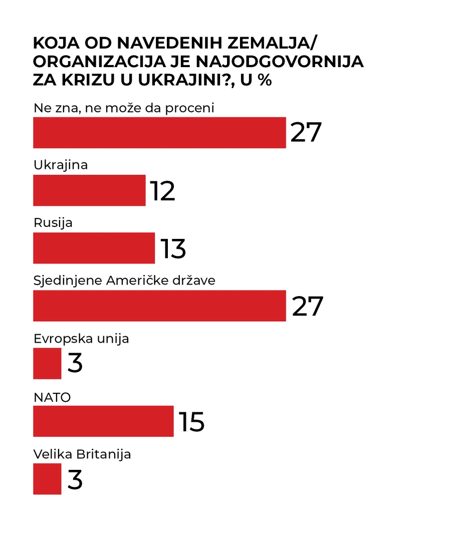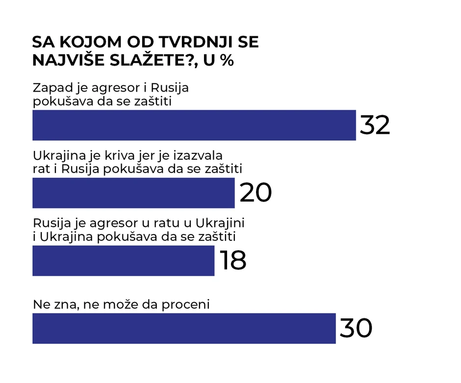 Osim tradicionalno negativnog stava prema jedinoj preostaloj vojnoj alijansi, na stavove mladih po pitanju Ukrajine svakako utiče i primat ruskog narativa koji je doveo do toga da se tek 18 odsto učesnika u ovom istraživanju slaže sa izjavom Rusija je agresor u Ukrajini i Ukrajina samo pokušava da se zaštiti.