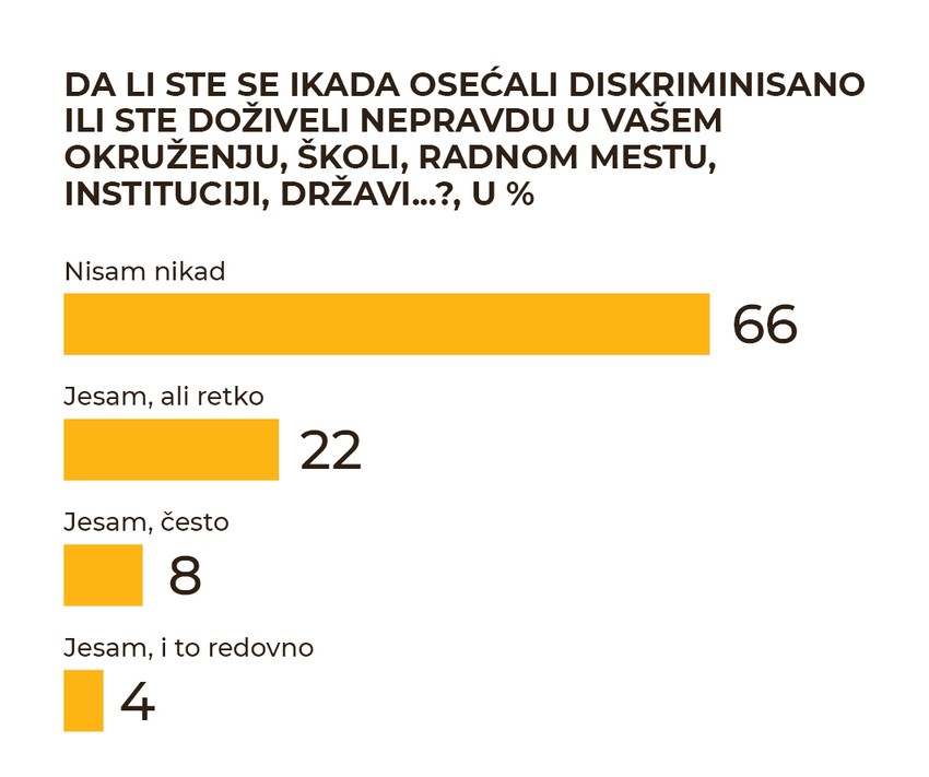 Dve trećine mladih (66%) nikada se nije osetilo diskriminisano niti je doživelo nepravdu u svom okruženju. Sa druge strane, 34% anketiranih se osetilo diskriminisano u određenoj meri.
