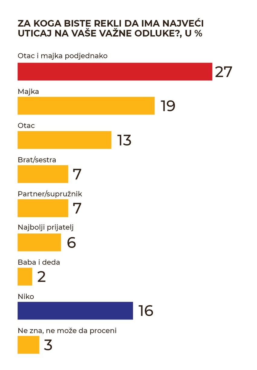 Što se tiče uticaja na važne odluke mladih, najveći procenat (27%) smatra da najviše uticaja imaju roditelji, pri čemu otac i majka imaju podjednak uticaj. Sa druge strane, 19% mladih smatra da je najveći uticaj na važne odluke samo majka, dok 13% navodi da je to najviše otac.