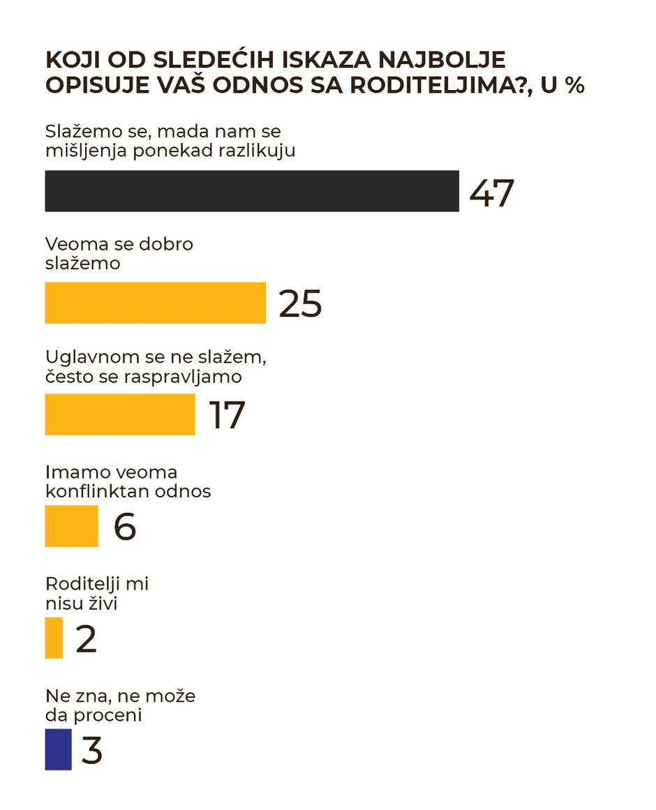 Kada je reč o odnosu sa roditeljima, većina mladih navodi da se sa roditeljima slaže, iako se mišljenja ponekad razlikuju (47%), dok četvrtina mladih navodi da se veoma dobro slaže sa roditeljima.