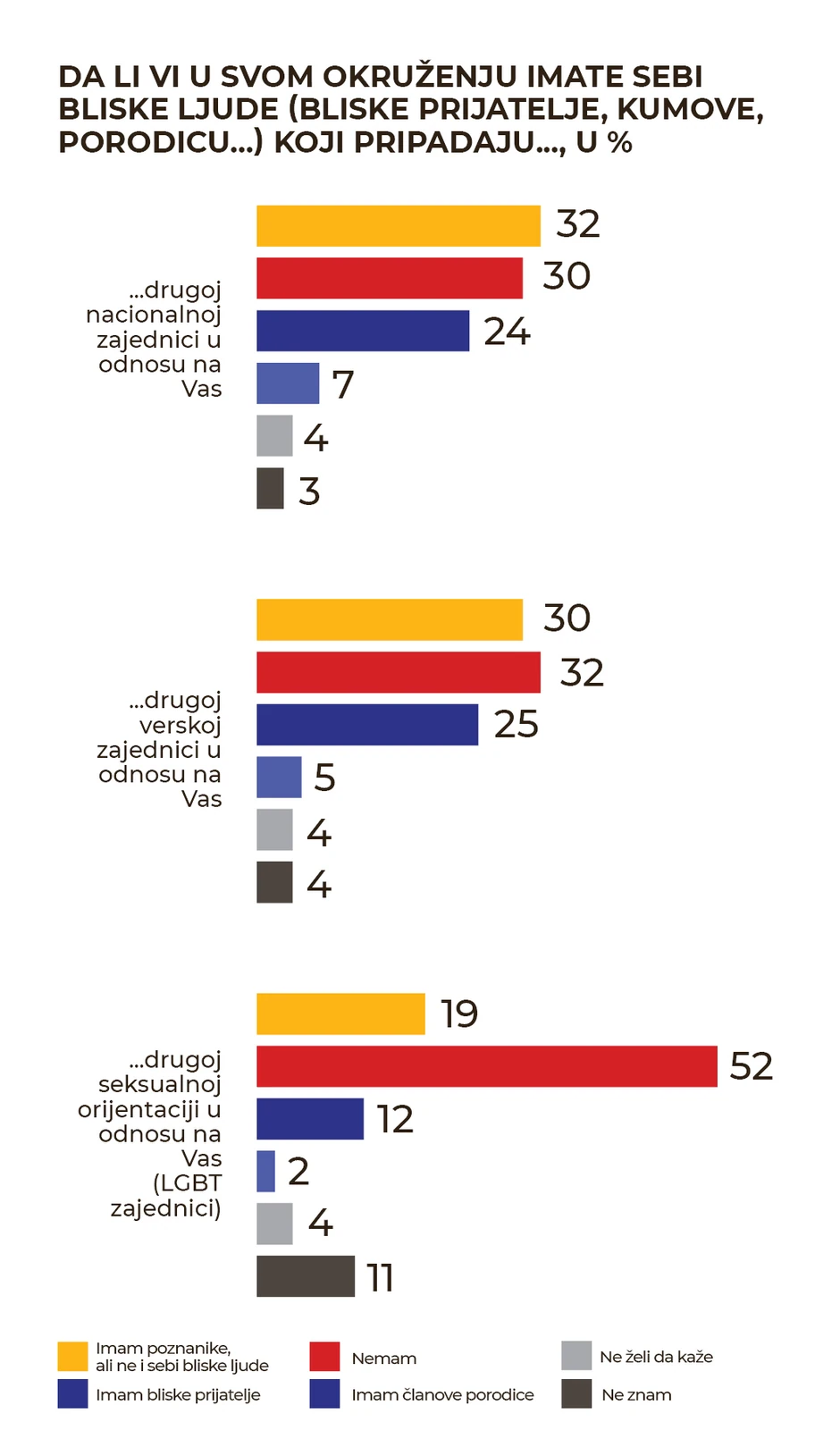 Bliske ljude koji pripadaju drugoj verskoj zajednici u odnosu na ispitanike, navodi da nema gotovo trećina – 32%. Takve poznanike, ali ne i sebi bliske ljude ima 30% mladih, a svaki četvrti (25%) ima bliske prijatelje koji pripadaju drugoj verskoj zajednici. Da su im bliski ljudi koji pripadaju drugoj verskoj zajednici i članovi porodice, navodi 5% anketiranih. Više od polovine mladih (52%) navodi da u svom okruženje nema bliske ljude koji pripadaju drugoj seksualnoj orijentaciji u odnosu na njih.