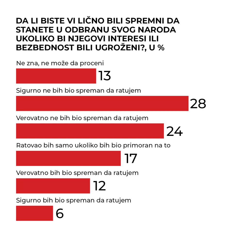 Procenat ispitanika koji su spremni da idu u rat radi zaštite interesa i bezbednost naroda kome pripadaju je manji od jedne petine.