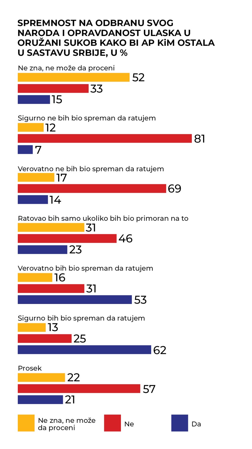 Kada je reč o aktuelnoj temi rešavanja sudbine Kosova i Metohije, ulazak u oružani sukob radi rešavanja ovog pitanja podržava tek svaki peti ispitanik.