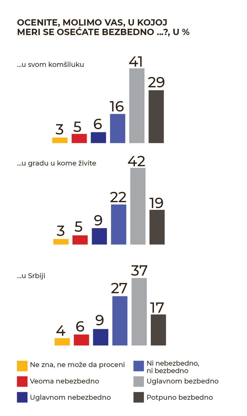 Utvrđujući stepen bezbednosti koji mladi osećaju u sredinama kao što su komšiluk, grad u kome žive i država Srbija, najveći procenat ispitanika rekao je da se tu oseća uglavnom i potpuno bezbedno.