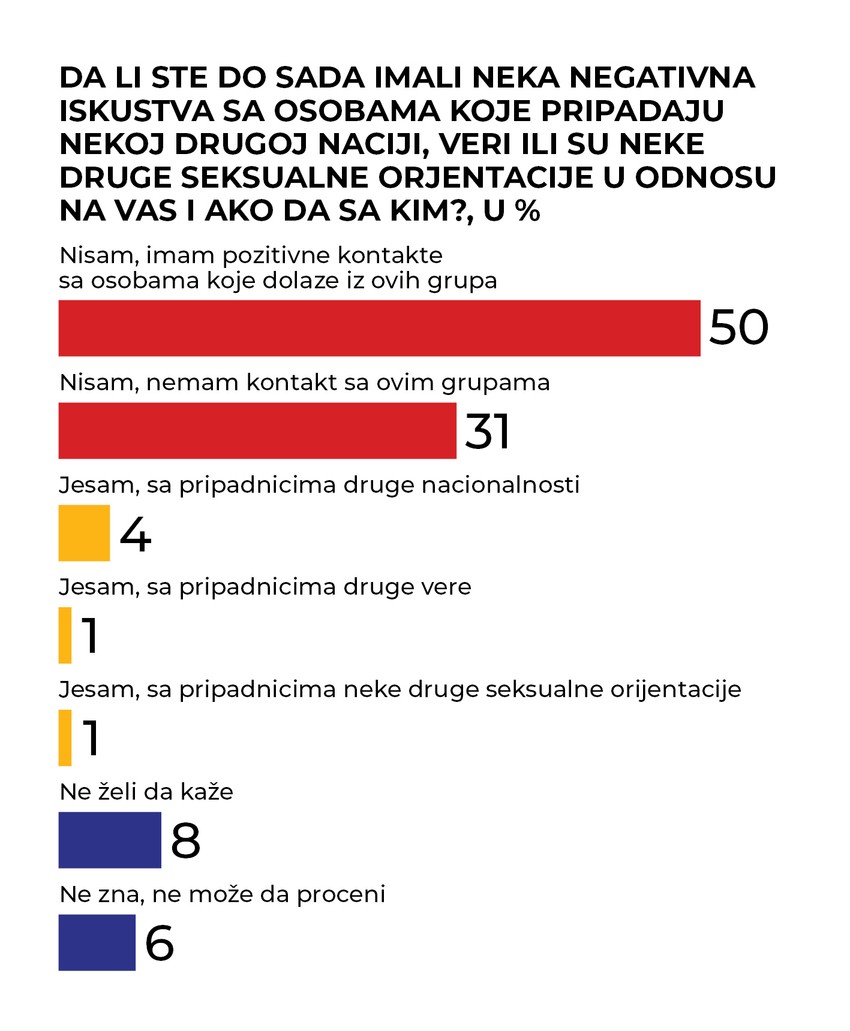 Na pitanje "da li su do sada imali neka negativna iskustva sa osobama koje pripadaju nekoj drugoj naciji, veri ili su neke druge seksualne orijentacije u odnosu na vas i ako da sa kim?" - da nisu imali negativno iskustvo sa ovim grupama, jer sa njima nemaju kontakt iznad proseka su navodili mladi od 15 do 19 godina i Srbi.