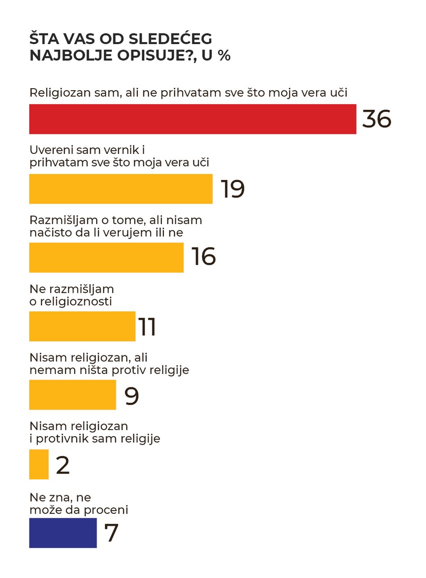 Najveći procenat mladih navodi da je religiozno, ali da ne prihvata sve što ih njihova vera uči (36%), dok 19% mladih navodi da je uvereni vernik i prihvata sve što ga njegova vera uči.
