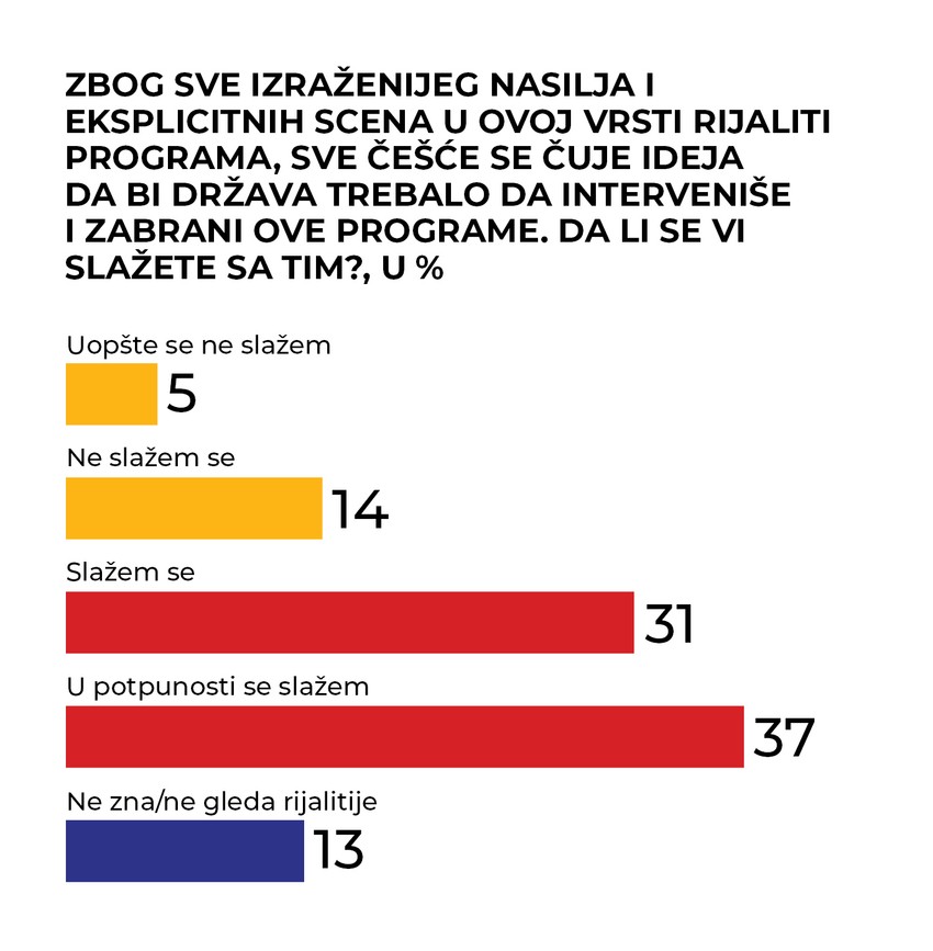 Najveći procenat mladih u Srbiji se u pot punosti slaže i slaže sa idejom da bi država trebala da interveniše i zabravi rijaliti programe (zbirno 68% mladih).