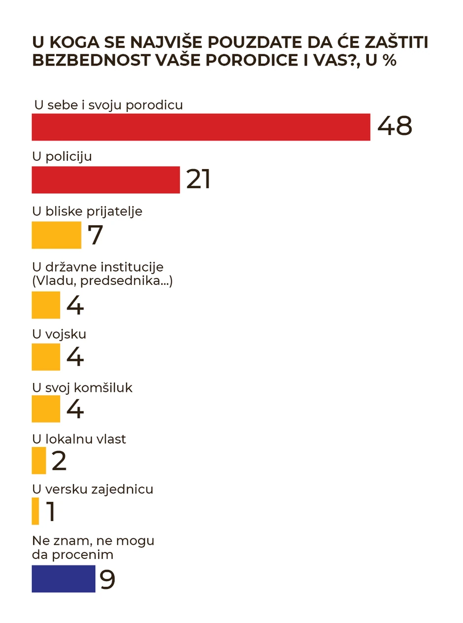 Gotovo polovina mladih (48%), veruje da se jedino u sebe i svoju porodicu može pouzdati da će im zaštiti bezbednost. Na drugo mesto mladi stavljaju policiju kao nekoga ko im može zaštititi bezbednost.