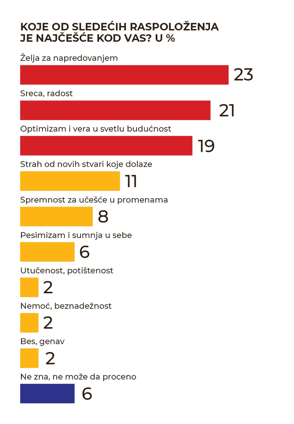 Većina mladih u Srbiji ima želju za napredovanje, srećni su i imaju veru u svetlu budućnost. Naime, na pitanje "Koje od sledećih raspoloženja je najčešće kod vas?", ukupno njih 63 ima pozitivna raspoloženja. Kako se pokazalo, među mladima u Srbiji najčešće raspoloženja su: želja za napredovanjem (23%), sreća i radost (21%) i optimizam i vera u svetlu budućnost (19%).