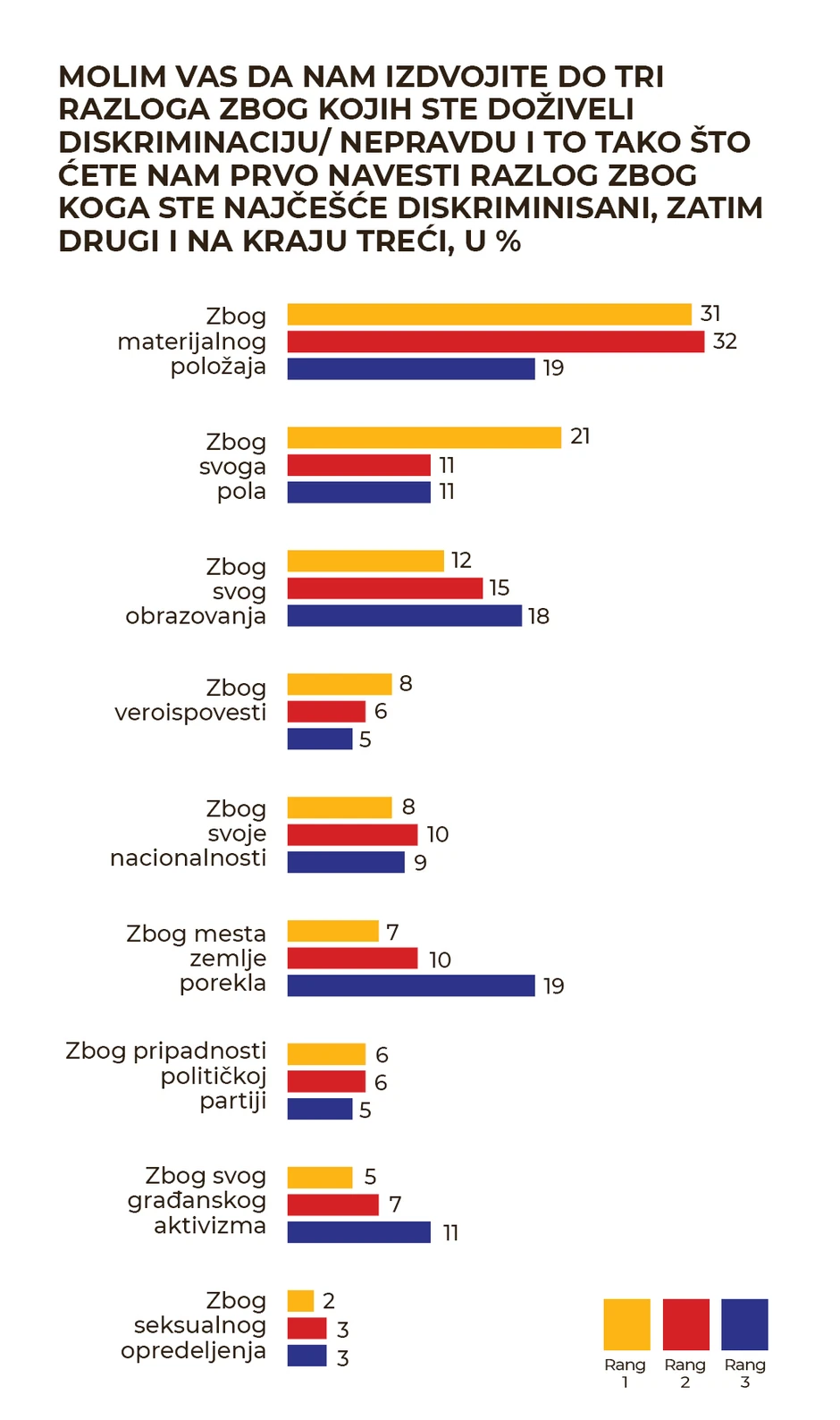 Najčešći razlog zbog koga su ispitanici bili diskriminisani je njihov materijalni položaj. Polovina mladih nije imala negativna iskustva sa osobama koje su druge vere, nacionalnosti ili seksualne orijentacije. Među 6% ispitanika koji su imali neko negativno iskustvo, 4% je takvo iskustvo imalo sa pripadnicima druge nacionalnosti, a po 1% jeste je to doživelo sa pripadnicima druge vere i neke druge seksualne orijentacije.