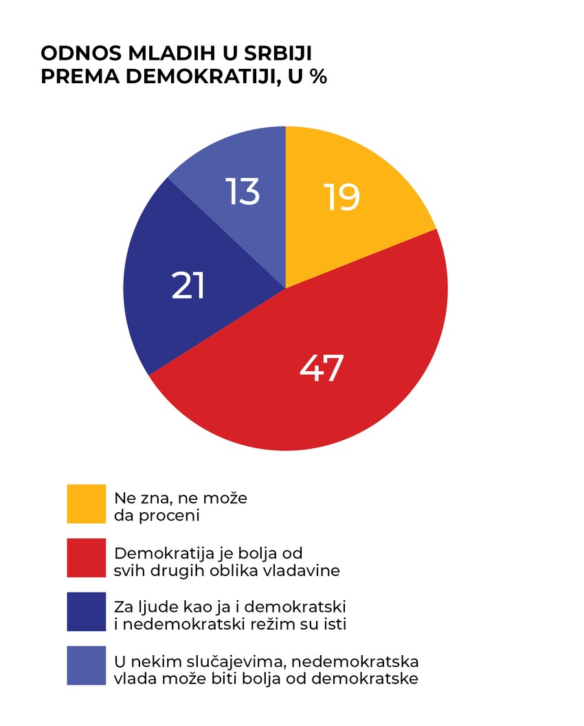 U ovom trenutku u Srbiji manje od polovine građana uzrasta 15 do 30 godina (47 odsto) veruje u vrednosti demokratije kao najboljeg sistema vladavine.