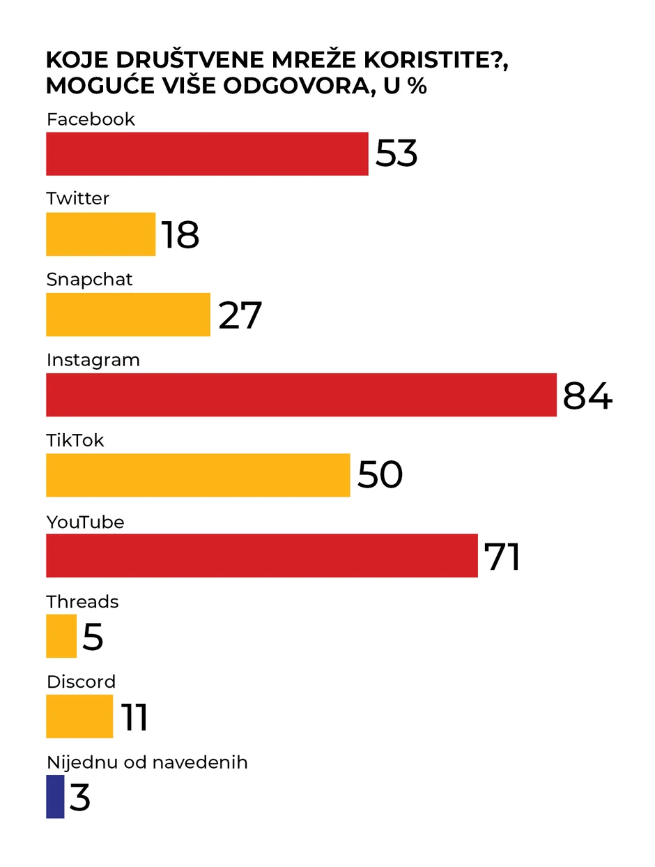 S druge strane, trećina mladih (33%) navodi da ne zna, ne može da proceni koji je to mediji. Kada je reč o društvenim mrežama, primećujemo da mladi najviše koriste Instagram (84%), zatim YouTube (71%), Facebook (53%) i na kraju TikTok (50%).