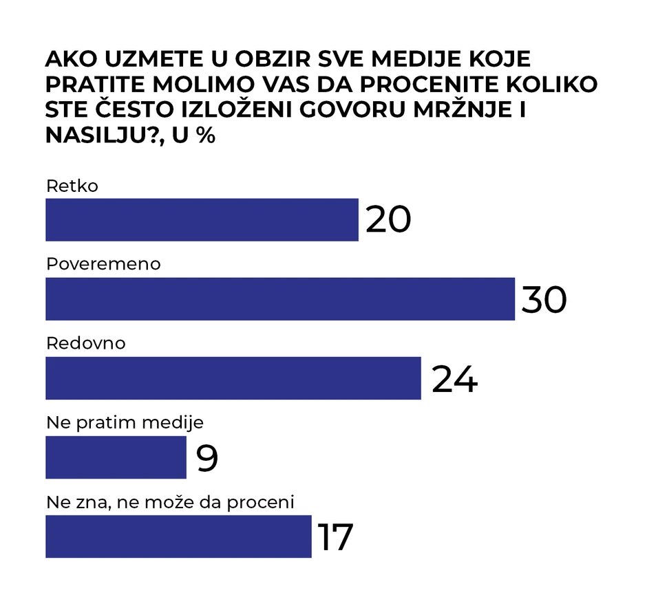 Skoro trećina mladih (30%) navodi da je povremeno izloženo govoru mržnje i nasilju preko medija koje prati, dok petina mladih navodi da je retko izložena govoru mržnje i nasilju na medijima. S druge strane, 24% mladih navodi da je redovno izložena govoru mržnje i nasilju na medijima koje prati.