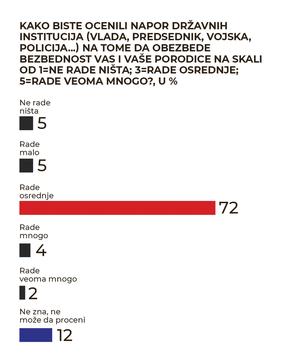 Kada ocenjuju rad državnih institucija koje rade na osiguravanju bezbednosti, 72% mladih navodi da one rade osrednje na tom planu. Iskazano prosečnom ocenom, ispitanici rad državnih institucija ocenjuju sa 2,53. Polovina ispitanika navodi da je tokom njihovog školovanja preovlađivala želja za druženjem i upoznavanjem novih ljudi, 46% osećalo je želju za učenjem i napredovanjem, a 39% njih navelo je optimizam i veru u svetlu u budućnost.