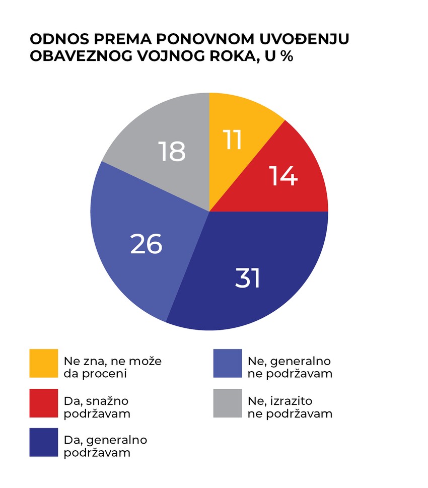 Procenat mladih koji podržavaju ponovno uvođenje vojnog roka je 45 odsto, naspram 44 odsto onih koji se protive toj ideji.