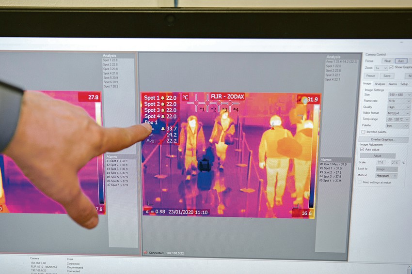 Da li zbog velikog aerozagađenja u našoj zemlji ili predostrožnosti zbog epidemije opasnog virusa, pred pasoškom kontrolom strpljivo je čekala grupica kineskih putnika "zamaskiranih" ispod zaštitnih maski na licu. Ali, pre nego što će svoje putne isprave dati na proveru, jedan po jedan, prošli su kroz specijalnu kontrolu telesne temperature, koja će isključiti zaraženost koronavirusom. U prostoriji pored, podaci se očitavaju na specijalnom kompjuteru pod budnim okom dr Raše Milanova, sanitarnog inspektora Ministarstva zdravlja. Ukoliko neko od putnika ima temperaturu višu od 37,9, oglasiće se zvuk alarma, a inače zelena linija na ekranu - pocrveni.