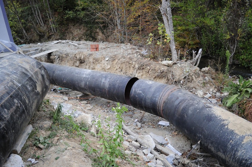 Baš tu na brani, planinska voda ulazi u cevi kojima će, kad postrojenje počne da radi, putovati nizvodno oko dva ili tri kilometra do mašinskog postrojenja za proizvodnju struje.