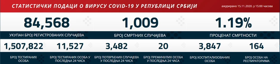 U Srbiji je u protekla 24 sata preminulo 20 osoba od posledica korona virusa, čime je ukupan broj žrtava premašio 1.000, odnosno sada iznosi 1.009. Trenutno je stopa smrtnosti prema podacima Instituta "Batut" 1,19 odsto.