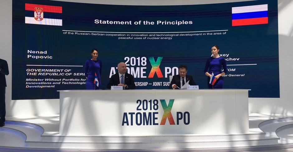 Sporazum o principima rusko-srpske saradnje u toj oblasti je potpisan u okviru međunarodnog foruma Atomekspo u Sočiju, a u ime ROSATOMA potpisao je stavio generalni direktor Aleksej Lihačov. Kao prioritetne pravce dokument predviđa podršku u stvaranju i razvoju nuklearne infrastrukture u Srbiji, usmerenoj na korišćenje nuklearne energije u mirne svrhe, razvoj nuklearne medicine, primenu radiacionih tehnologija u poljoprivredi i industriji, povećanje kvalifikacija administrativnog, naučnog i tehničkog kadra u oblasti primene nuklearne energije u mirne svrhe kroz obuku i stažiranje, kao i povećanje ukupnog nivoa informisanosti grdjana o nuklearnim tehnologijama i njihovoj primeni u drugim sferama.
