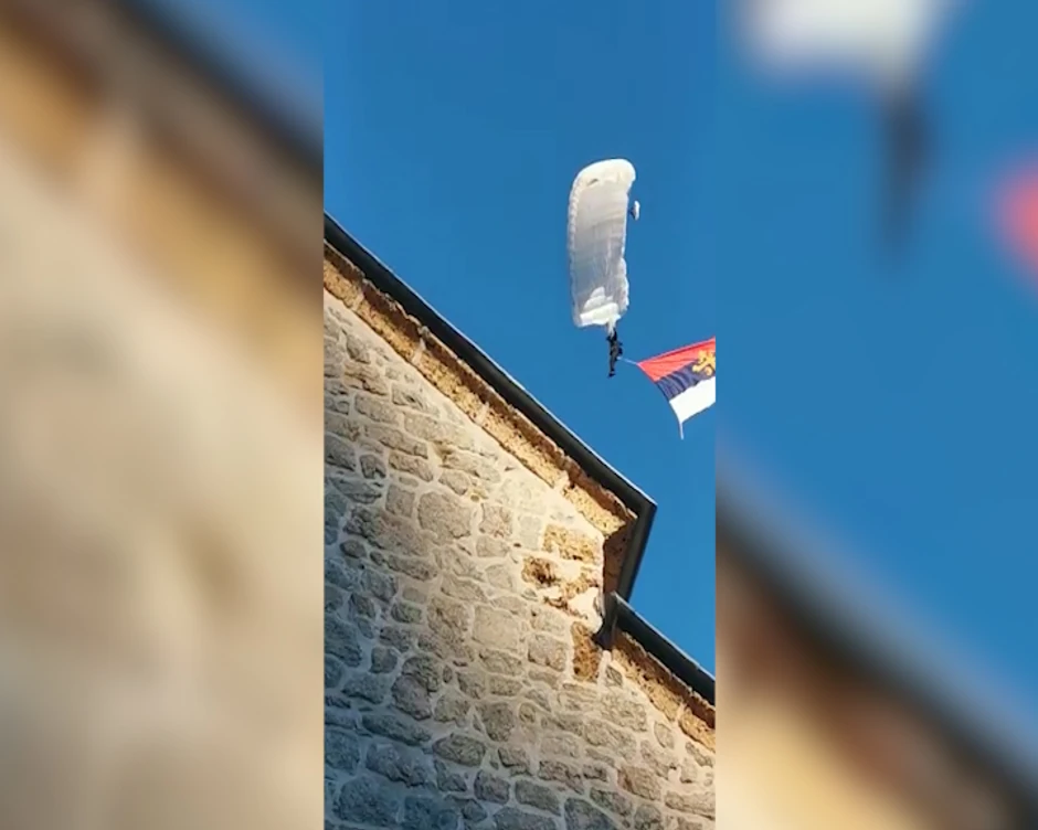 Sa njim padobranom je skakao i pukovnik u penziji Nenad Kuzmanović noseći srpsku trobojku.