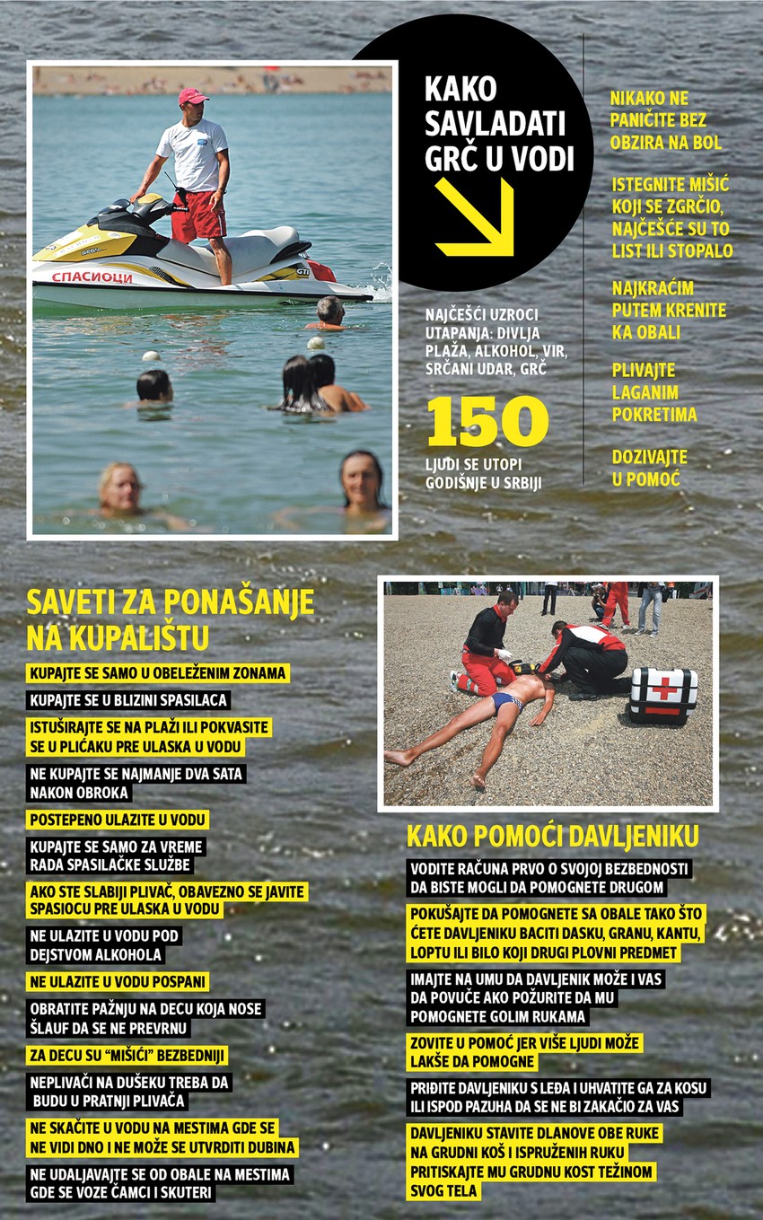 - U vodi stalno vrebaju opasnosti od virova, trave, grčeva. Zbog toga bi svako morao realno da proceni svoje sposobnosti, da li je plivač ili ne, odnosno poluplivač i da se u skladu s tim ponaša na kupalištu. Nažalost, sve više roditelja pušta decu samu sa drugarima na kupanje, ali i kada idu sa njima, često ih ne nadziru. Dešava se i da ih izgube u vodi, pa ne mogu da ih nađu, što je nedopustivo, naročito za uzrast od 8 do 15 godina - ističe Vladimir Grujić, predsednik Udruženja spasilaca na vodi.