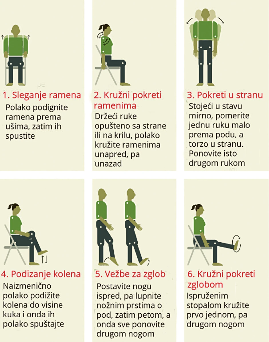Zagrevanje tela za vežbanje da biste sprečili povrede treba da traje oko pet minuta, nakon čega bi trebalo da ste blago zadihani. Vežbe za zagrevanje možete izvoditi u sedećem ili stojećem položaju. Svaki pokret ponovite 2-4 puta.