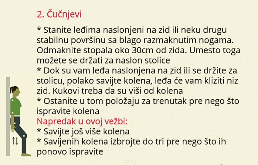 Vežbe za mišiće će vam pomoći da poboljšate muskulaturu koja je oslabljena usled bolesti i trebalo bi da ih radite tri puta nedeljno. Zadajte sebi cilj da odradite tri puta po 10 ponavljanja svake vežbe, uz kraći odmor između svake od tri serije.