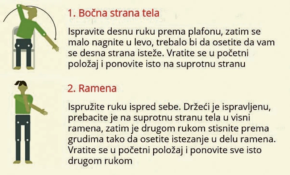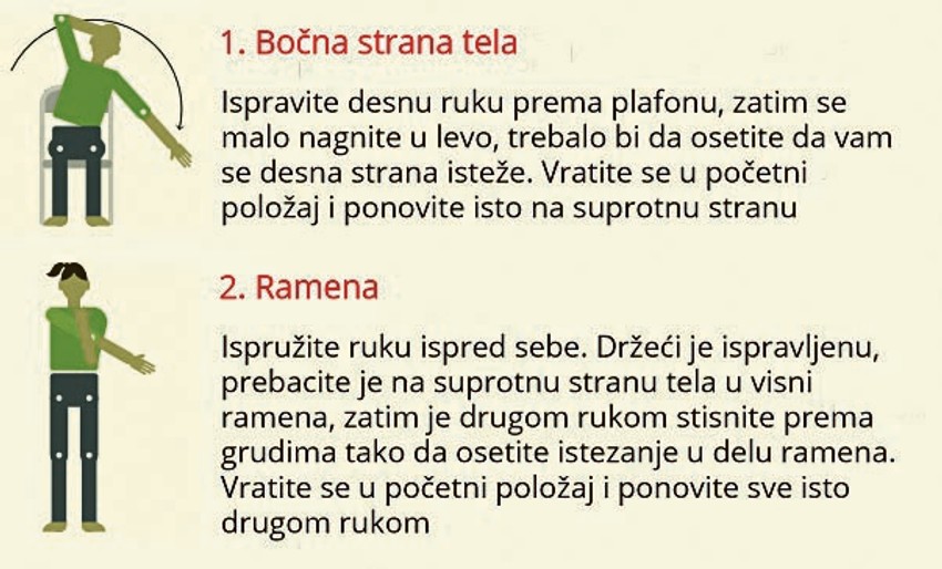 3. Istezanje možete izvesti sedeći ili stojeći, mora da bude lagano i ostanite u istegnutom položaju 15-20 sekundi.