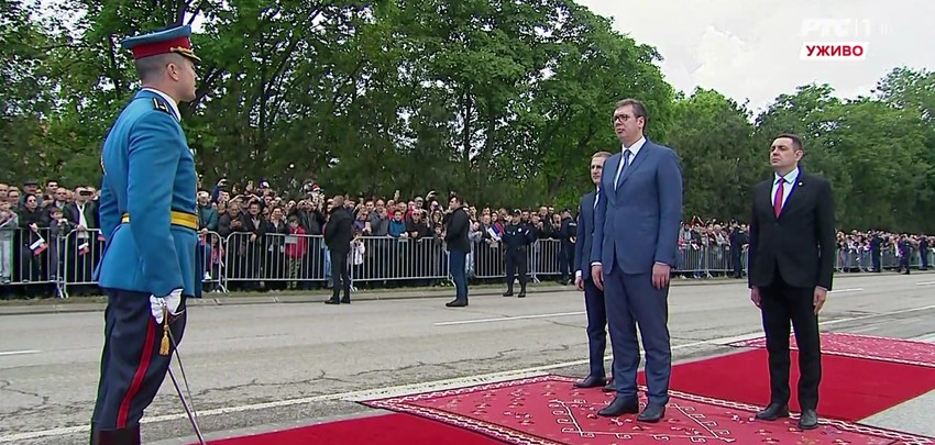 11.01 - Stigao Vučić - Predsednik Srbije Aleksandar Vučić stigao je na mesto gde se održava parada, koja je počela intoniranjem himne "Bože pravde". Njega je dočekala počasna garda, a raport predsedniku podneo je major VS Miša Živković.
