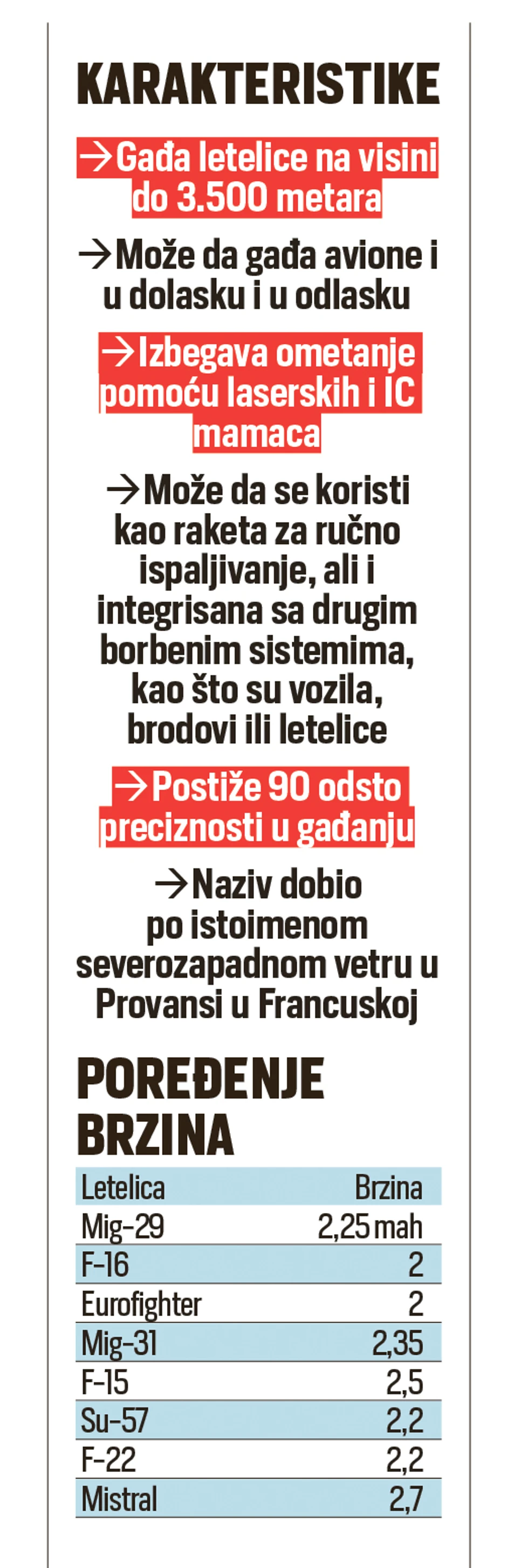 - "Mistral" je raketni PVO sistem za male visine, a Srbija dobija najnoviju verziju koja ide više od šest kilometara u daljinu i više od tri i po kilometara u visinu. Ima bojevu glavu koja je neosetljiva na ometanje, rukovodi se toplotnim izvorom sa aviona, odnosno gađa motor letelice - objašnjava Lazanski.