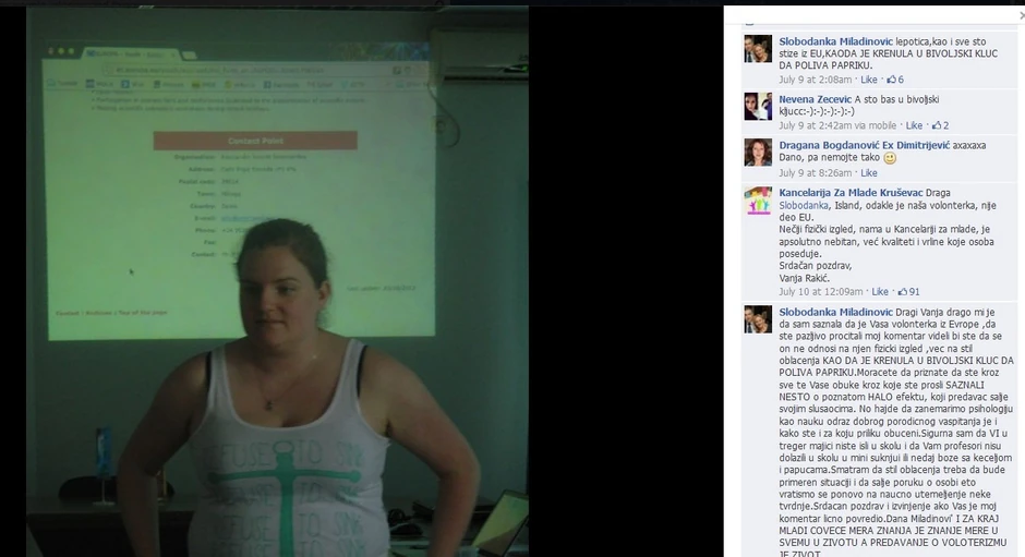 "Dragi Vanja drago mi je da sam saznala da je Vaša volonterka iz Evrope ,da ste pazljivo prcitali moj komentar videli bi ste da se on ne odnosi na njen fizicki izgled ,vec na stil oblacenja KAO DA JE KRENULA U BIVOLJSKI KLUC DA POLIVA PAPRIKU.Moracete da priznate da ste kroz sve te Vase obuke kroz koje ste prosli SAZNALI NESTO o poznatom HALO efektu, koji predavac salje svojim slusaocima. No hajde da zanemarimo psihologiju kao nauku odraz dobrog porodicnog vaspitanja je i kako ste i za koju priliku obuceni.Sigurna sam da VI u treger majici niste isli u skolu i da Vam profesori nisu dolazili u skolu u mini suknjui ili nedaj boze sa keceljom i papucama.Smatram da stil oblacenja treba da bude primeren situaciji i da salje poruku o osobi eto vratismo se ponovo na naucno utemeljenje neke tvrdnje.Srdacan pozdrav i izvinjenje ako Vas je moj komentar licno povredio.Dana Miladinovi' I ZA KRAJ MLADI COVECE MERA ZNANJA JE ZNANJE MERE U SVEMU U ZIVOTU A PREDAVANJE O VOLOTERIZMU JE ZIVOT .."
