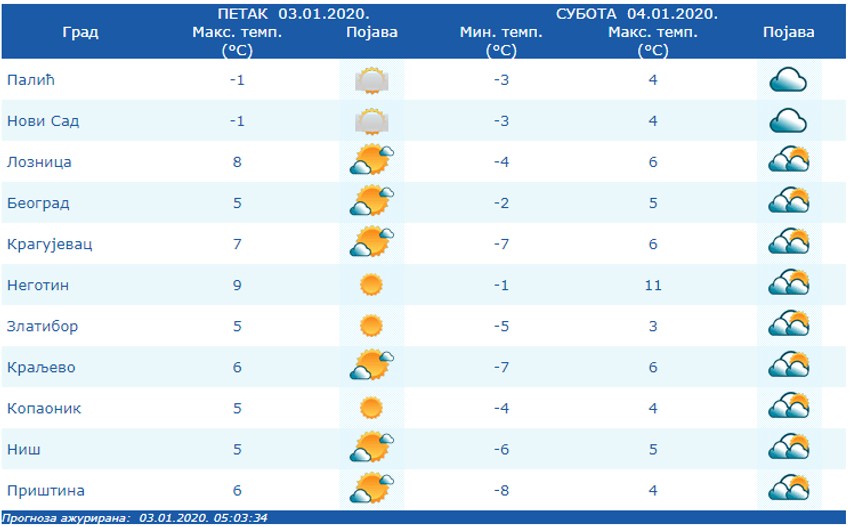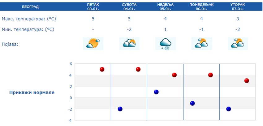 Tokom dana pretežno sunčano, uz slab vetar promenljivog pravca. Jutarnja temperatura od -7 do -2, najviša dnevna od 3 do 5 stepeni.