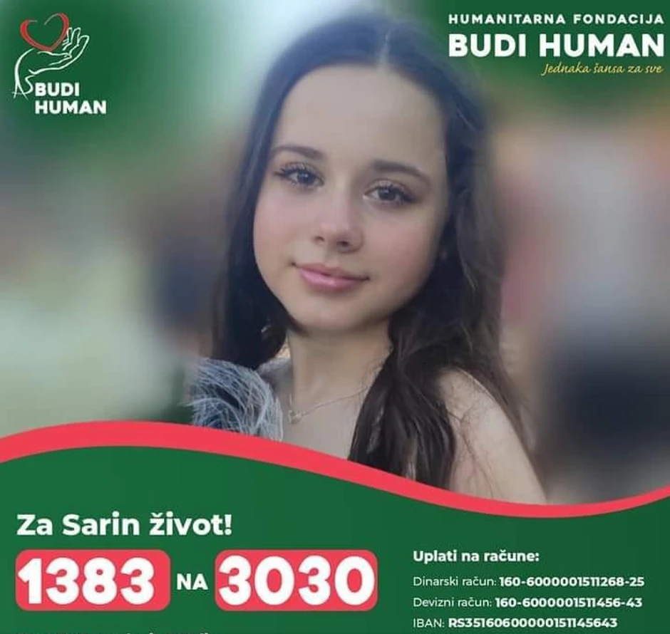 Devojčica Sara Prljinčević (15) boluje od opake bolesti, a njena porodica sada apeluje na sve dobe ljude da joj pomognu kako bi se prikupio novac koji joj je preko potreban za lečenje, kako bi kao i svi ostali njeni vršnjaci mogla da se vrati normalnom životu tinejdžerke.