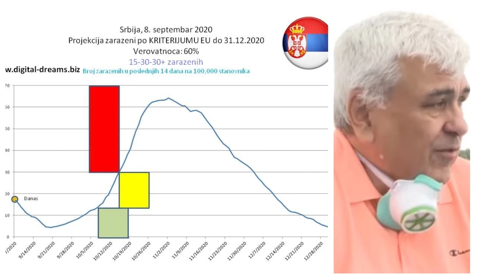 - Ovo je početna prognoza kretanja zaraženih do 31. decembra 2020. Verovatnoca 60 odsto - poručio je na svom fejsbuk profilu Petar Kočović.